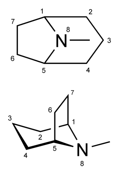 托烷类物质是指在其结构中含有取代托烷环的分子。托烷是一种含氮双环有机分子,由哌啶和吡咯烷环在碳 R1 和 R5 处稠合而成,并在 RN 处有一个额外的甲基取代。它主要因衍生自它的一组生物碱而闻名。托烷生物碱通常在 R3 处被醚桥取代(如在东莨菪碱、阿托品、莨菪碱和可卡因中可见)。也存在托烷生物碱的合成类似物,例如苯基托烷类。根据定义,它们不被视为生物碱。
