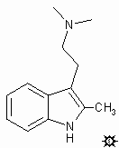 该化合物也曾通过 3-甲基吲哚乙酸经乙酯合成,用钠和醇还原为乙醇衍生物,在乙醚中用三溴化磷转化为乙基溴,再与二甲胺反应得到产物(2-Me-DMT)。据报道游离碱的熔点为 97-98 °C。