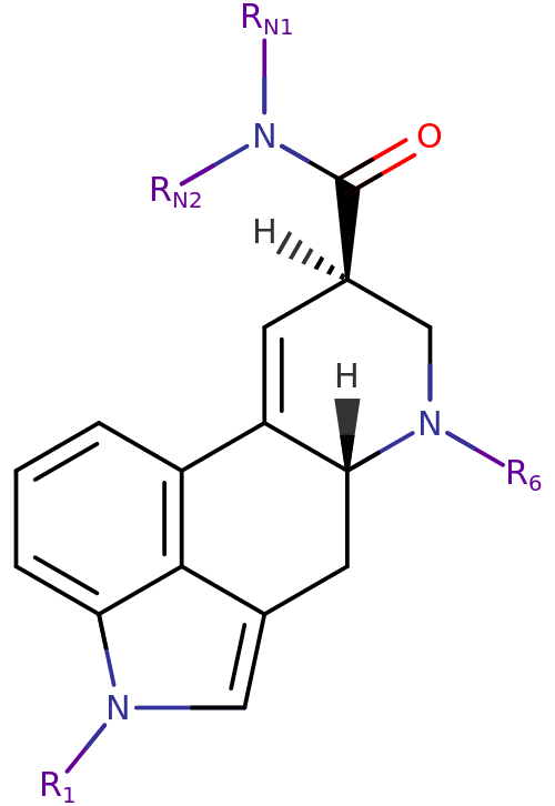 PARGY-LAD 的结构包含一个稠合到双环喹啉基团(去甲麦角酸)的双环六氢吲哚。与 LSD 不同,PARGY-LAD 的去甲麦角酸骨架的 R 位没有取代甲基,这由“去甲” (nor-) 前缀表示。相反,PARGY-LAD 在 R 位被一个丙炔基取代。